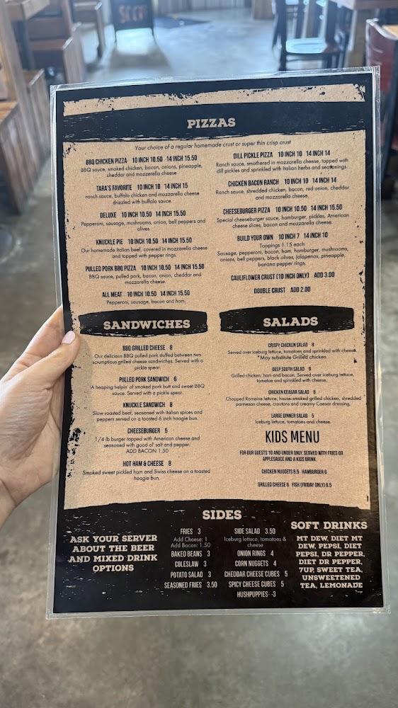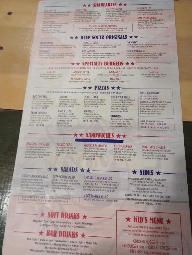 Deep South's menu is diverse and inviting. Specialty burgers like the Morning After Burger and jalapeno options are favorites. Pizza options range from classic cheese to BBQ chicken. Casual lunch items like sandwiches and salads round out the offerings. There's something for everyone, including a kid's menu. The desserts, though limited, offer a sweet ending to any meal. Overall, the menu combines tradition with creativity.